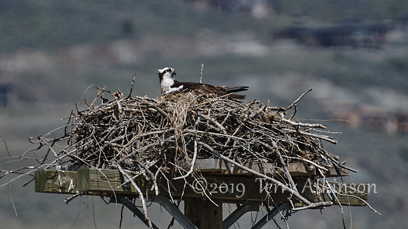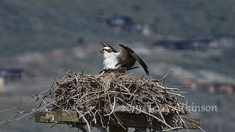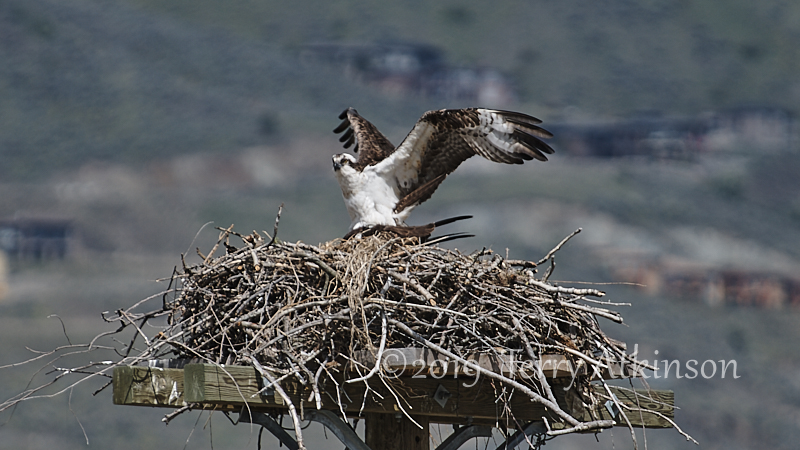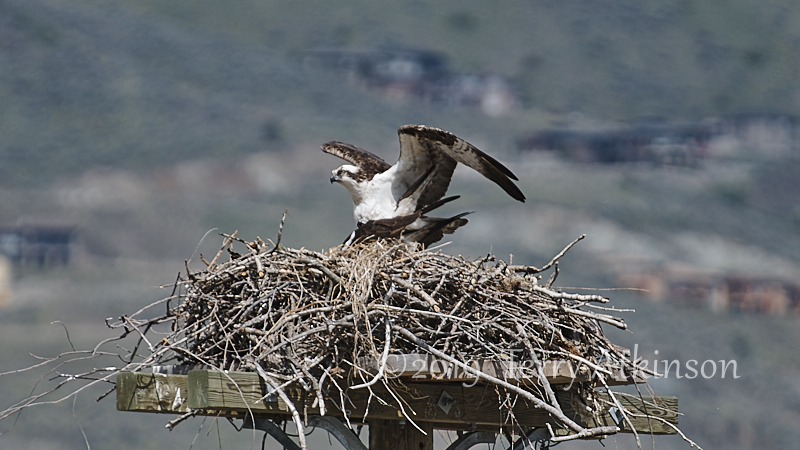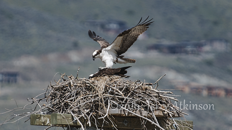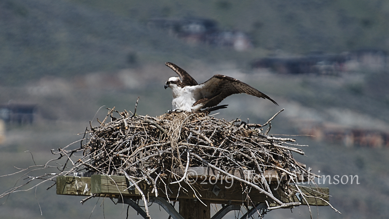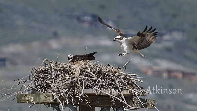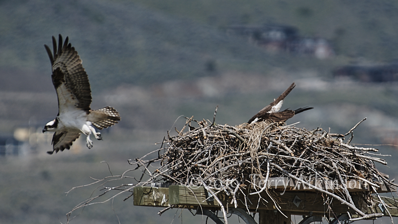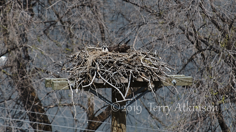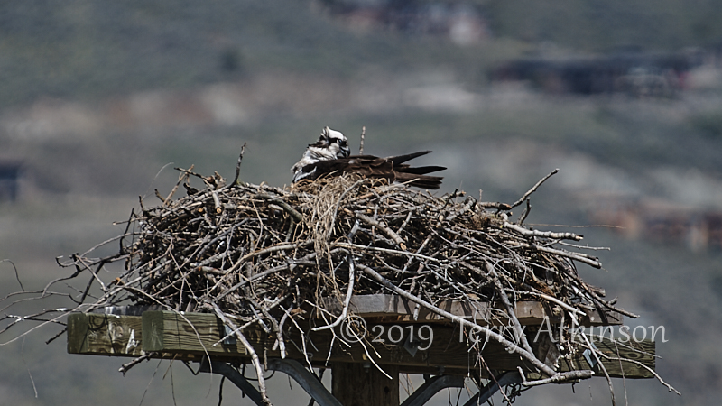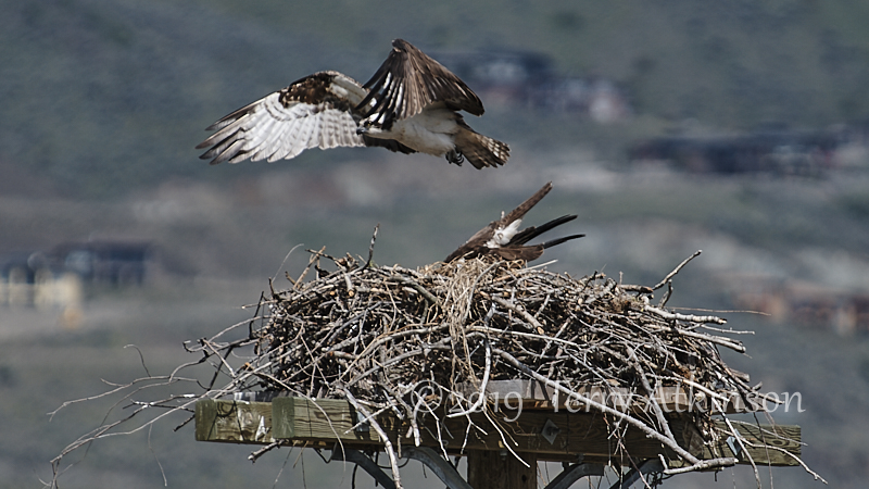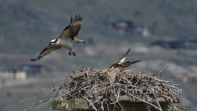 I went back a couple days later with my camera, hoping to see some parents coming by. Just as I arrived, an adult osprey was flying off. So I set up and shot some photos of the osprey in the nest, waiting for the other to show up again. After about 30 mins the other osprey flies to the nest, kind of lands on the one in the nest, stays for less than a minute, and then takes off.