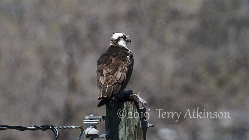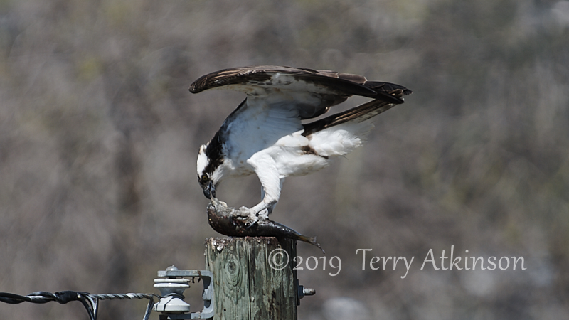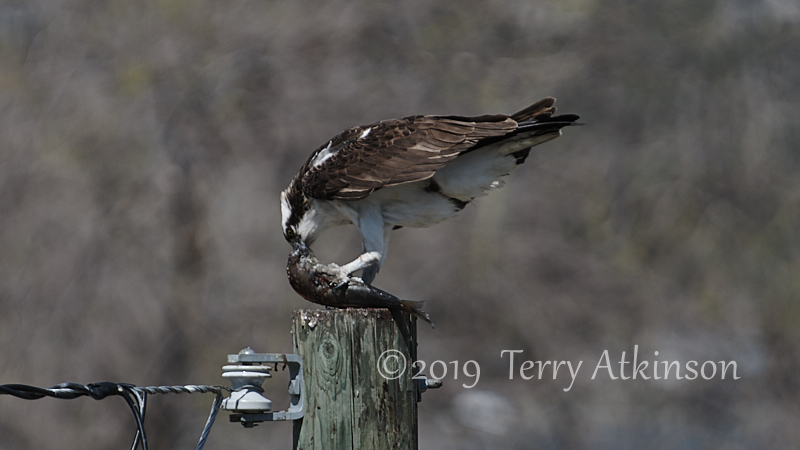 Update: I went back the next day. The male was hanging out on a telephone pole. Eventually he begins to eat a fish he had in his talon. Here is a link to a rather long slo-mo video of the event.